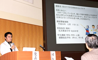 浜松市生涯学習課が生涯学習の取り組みをより一層推進することを目的に、浜松市内4大学が17講座を開講。本学は、健康プロデュース学部(こども健康学科、心身マネジメント学科、健康鍼灸学科)、保健医療学部(理学療法学科、作業療法学科)が6講座を開講しました。報告会には3学科が代表で参加し、健康鍼灸学科の学生で構成される「SinQ」は中学生向けに開いた講座において、「ツボを知ってもらい、セルフケアの重要性を伝えるいい機会になった。教える立場に立ち、自分の知識を深める場となった」と発表。理学療法学科の松村剛志ゼミの学生は、「高齢者に現在の歩き方や体の状態を確認していただき、けがをしない歩き方を一緒に考え、アドバイスをすることができた」、心身マネジメント学科の林田はるみゼミは、「大学で学ぶ健康スポーツ指導の知識をもとに、小学生がコミュニケーション能力や持久力向上を目指した指導ができた」と発表しました。