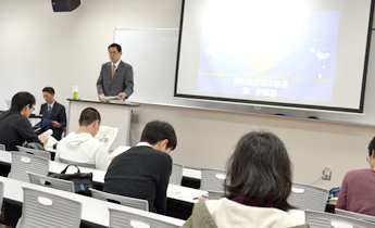 筋本部長は、最近のトピックとして、特殊詐欺やサイバー犯罪、交通事故や災害対策などについて県警の取り組みを説明、静岡県警の組織や女性の登用などについても概要を説明しました。授業を担当する細川学部長は「犯罪を扱う刑法の講義の前提としての知識は大事」と、本部長の講義の意義を学生にアピールしました。