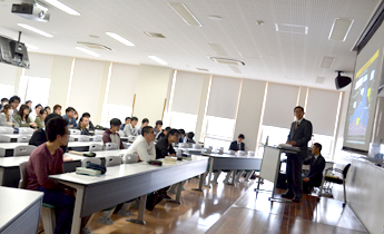 静岡キャンパス水落校舎で4月18日(火曜日)、法学部の「刑法Ⅱ」の講義の一環で、静岡県警の筋伊知朗(すじ・いちろう)本部長が「警察行政の現在」と題して講義を行いました。刑法Ⅱの受講生ほか、法学部学生120人程が、刑法犯認知件数等の推移や、犯罪に強い社会の実現のための行動計画、治安に関する国民の意識調査などについて、熱心に耳を傾けました。