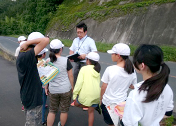 小学生は普段通学する道を、意識して歩くことにより「ここは雨が多いと土砂崩れが起きそう」、「手すりが無いから危ない」、「歩道が狭いから、自転車と一緒には通れないね」と、さまざまな意見が出ました。