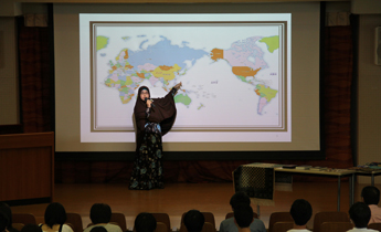 エフィ氏はまず、イスラム教の経典や教えについて、実物を見せながら解説した後、1日5回決められた時間に祈祷する習慣や4週間の断食期間のこと、女性が頭からスカーフで覆う理由などに触れ、会場からは感嘆の声が上がりました。豚肉を食べない習慣については、避けるのが豚肉だけでなくショートニングやゼラチン等にも及ぶことなど、日本人の盲点も紹介され、学生らは興味津々に聞き入り、質疑応答も活発に行われました。イスラム教と教徒について理解が深まった講演でした。