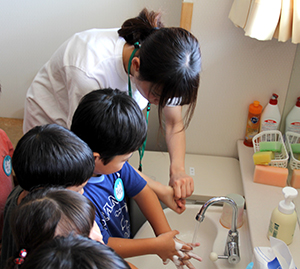 これは、看護学科小児看護学教員が担当する「看護基礎ゼミナール」を受講する学生10名が、「基礎看護学」で学習した手洗いの技術を園児に伝え、清潔意識の向上や手洗い方法の習得を目的としたもので、当日は3クラスに分かれて園児に手洗い指導を行いました。