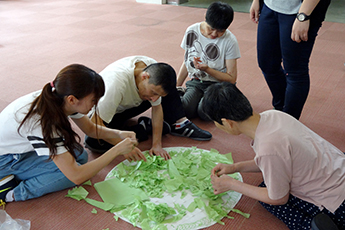 本交流会は、赤塚ゼミにおいて障害児支援をテーマに学んでいる学生が障害への理解を深め、支援方法を実践的に学ぶ機会として、昨年度から継続的に行っています。学生の学びの場であると同時に、施設で生活する障害のある方々の余暇支援として充実した時間となるよう、毎回保育学部らしい趣向を凝らした企画を心掛けています。今回は、昔話「花さかじいさん」のパネルシアターや、それにちなんだ制作活動を中心に、体操や歌などを交えながら1時間のプログラムを施設の皆さんと楽しみました。