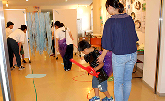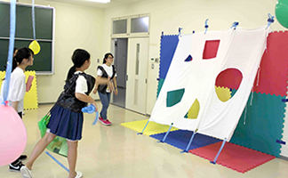 富士キャンパスでは、26名の子どもと63名の学生ボランティア(静岡キャンパスの教育学部生11名と富士キャンパスの保育学部生52名)が、午前中は夏休みの宿題を中心とした学習活動を行いました。午後は、忍者の修行をテーマにスタンプラリーを行いました。スタンプラリーでは、教育学部で理科教育を専攻する学生があぶりだしなど理科の要素を含んだブースを開設したり、保育学部の学生が忍者サーキットを準備するなどの工夫によって、子どもたちは、友だちやボランティアと協力しながら楽しんで参加する様子が見られました。