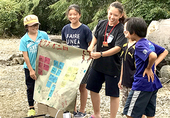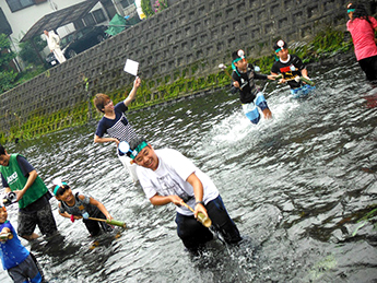 今年は市内を流れる清流 滝川の水辺で生き物とのふれあいに目を見張っただけでなく、かぐや姫伝説など地元の伝承も盛り込んだ演出で、学生が考案したオリジナルの活動(ゲームや実験)を実施しました。特に今回は水が命を育むことや、富士市の豊富な湧水は富士山が生み出していることに気づかせることを目的に、川の中で生物採集しただけでなく、「富士山の雨水貯留モデル実験」や「ホタルの生態のシミュレーションゲーム」を企画し体験してもらいました。子どもたちはかぐや姫が投げかけた謎を解きながら水辺を探検し、最後は「竹取水合戦」で大きな歓声を上げました。