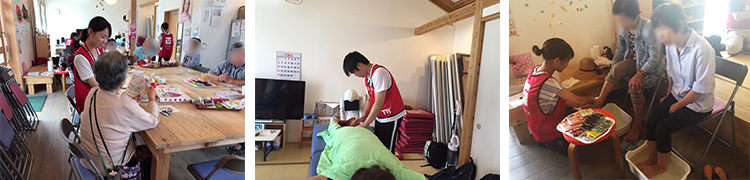 益城町テクノ団地では、静岡茶と静岡のお菓子を提供する「TOKOHAMAカフェ」と健康鍼灸学科の学生が担当する刺さない鍼ともみほぐしを行う「SinQブース」をオープン。カフェを利用してくださった方々は、2日続けて来てくださる方もいるほど大盛況。震災直後の写真を持参いただいたり、当時の様子を語ってくださったりと、学生たちと交流を深め、貴重な現地の方の声をお聞きする機会となりました。