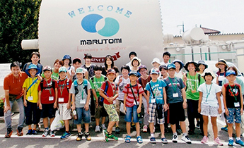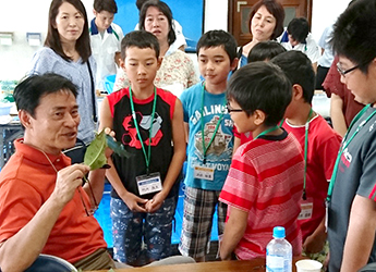 丸富製紙の工場で紙パックのリサイクルを見学した後、白糸の滝の広場で水と富士山のユニークな学習を楽しみました。地球を描いたビーチボールを投げて、海と陸の割合を確かめたり、一滴の水に変身して地球を旅する「驚異の旅」や、富士山に降った雨や雪が富士山周辺で湧水として現れるまでどれくらいの年月を要するかをモデル実験で確かめたりしました。参加者は親子で学校とは一味違った楽しい学びに熱中していました。