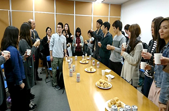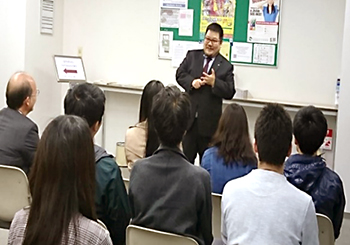 初めに、総領事館の業務内容(在住ブラジル人の公的手続や、生活に必要な情報提供、外国人がブラジルに渡航する際のビザ発給業務など)について説明してもらいました。副総領事パウロ・アマード氏からは、ブラジルの歴史や地理・文化の多様性に関するお話しを伺い、学生たちはブラジルを代表する食べ物ポン・デ・ケイジョを味わいながら、副総領事との歓談を楽しみました。