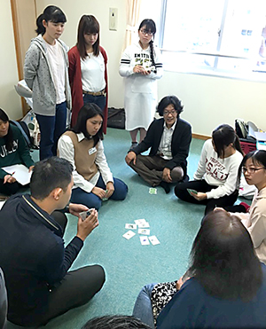 3回に渡って行われる講座の第2回では「遊びを通して『減災』を伝える人になる」をテーマに、教材の「減災が学べるトランプ」を活用して行われました。