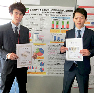 健康プロデュース学部生を対象とした調査により、足関節捻挫の治療実態を調査した福田さんの発表では、治療を行う医療機関において治療方法の傾向や予後が異なることが示され、多くの聴衆の関心を引きました。