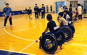11月4日(土曜日)は保健医療学部の学生で構成するサークル「障☆スポSC」が主体となり障がい者スポーツを地域の方と楽しみました。競技はリオパラリンピックで注目された「ボッチャ」を中心に、視覚障がい者の球技「ゴールボール」、座ったままの姿勢で行う「シッティングバレー」を紹介。子どもから年配の方まで幅広い世代の方が参加し、楽しく体験していただきました。また、生活用車いすとスポーツ競技用の車いすの乗り比べも行い、参加者に重さや操作性の違いを感じていただきました。