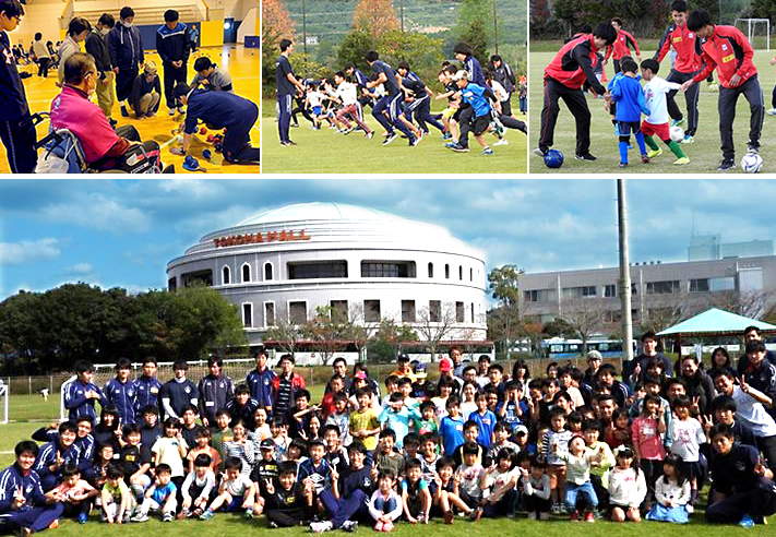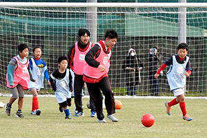 11月19日(日曜日)は、サッカー部が約60名の小学生を対象にサッカーの楽しさを体験し、技術力の向上を目的としたサッカー教室を開催。約100名の部員が、3つのカテゴリーに分かれ、パス、シュートの基礎練習をした後、ゲーム形式で実践的にアドバイスしました。ゲームでは、大学生と子ども達の混成チームを結成。サッカー経験のある子どもたちが多く、大学生を相手に、真剣勝負で挑んでいました。