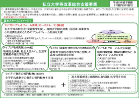 平成25年度から開始された私立大学等改革総合支援事業は、教学面からの大学改革に組織的・体系的に取り組む私立大学等を選定しています。今年度は、各大学等の特色化・資源集中を促し、複数大学間の連携、自治体・産業界等との連携を進めるためのプラットフォーム形成を通じた大学改革の推進を支援するタイプ5が新設されました。今回本学が採択されたのが、このタイプ5です。全国で21のプラットフォームが申請し、9件が選定されています。