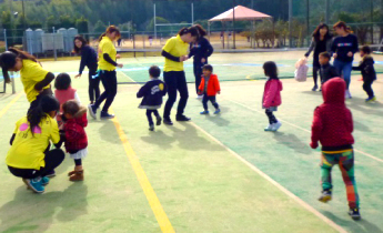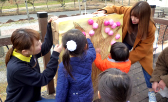 「花咲かじいさん」をモチーフにしたクイズエリアでは、昔話に関するクイズに正解すると桜色のボールがもらえ、幹が描かれた大きな紙にボールを貼り付け、子どもたちはたくさんの花を咲かせていました。室内では、マットや運動器具で遊ぶエリア、健康栄養学科の学生が作った野菜を使ったミニカステラの試食コーナーもあり、子どもたちはそれぞれのエリアを楽しみました。
