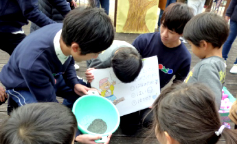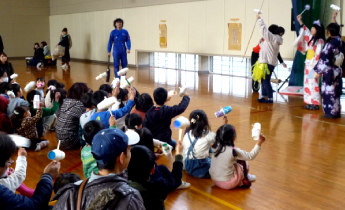 そして、終わりの会では、桃太郎やかぐや姫に扮した学生と、作成した打ち出の小槌で鬼を退治しました。