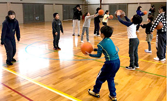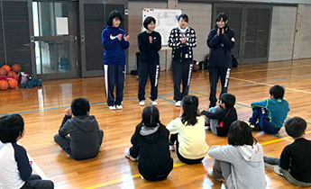 2月17日(土曜日)に浜松キャンパス女子バスケットボール部に所属する学生4名が、浜松市立水窪小学校の児童にバスケットボールの体験講座を開講しました。これは浜松市と大学が連携して生涯学習を進める事業の一環として、小学生がバスケットボールの基礎を学び、楽しさを知ってもらう事を目的に行われました。