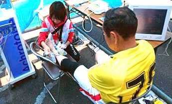 この大会は全国から40歳~90歳代(最高齢96歳)の選手が1,000名以上も参加する日本で最大級のシニアサッカー大会であり、参加した学生は理学療法士の先生方の活動補助やグラウンドでのトレーナー活動を行いながら、学内外での机上の学習や臨床実習とは違う中高年のスポーツ動作とサポート活動を学ぶことができました。また、理学療法士のスタッフの中には、多くの本学科卒業生が参加し、各会場で学生指導役として貢献していました。