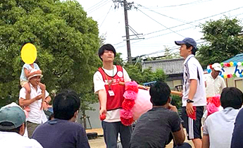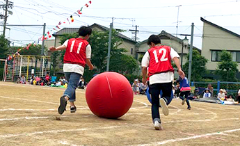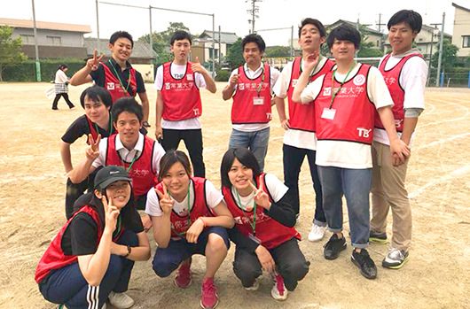 学生は、前日から保護者の方々と協力してテント設営や備品の準備を行い、当日は放送補助や記録写真撮影、各競技の備品準備や入場門での児童招集を行いました。また、学生も「大玉転がし」に参加し、運動会を盛り上げました。