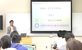 講義では、前田先生より美容鍼灸師にとって有用な知識や、男性美容鍼灸師ならではの強みなどを紹介いただき、「学業への本気度は、現場に出てからの活躍度と比例する。ぜひ、大学生のうちにいろいろな先生に出会ってほしい」とエールをお送りいただきました。