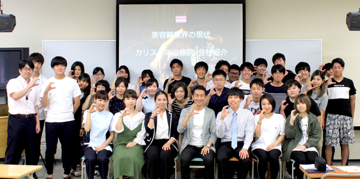 7月11日(水曜日)に本学浜松キャンパスにて、健康プロデュース学部健康鍼灸学科の学生を対象に、美容鍼灸セミナーが行われました。セミナーには、カリスタ株式会社の代表取締役社長・前田真也先生、シーバイカリスタの店長・岡田也実先生、スタッフ・三浦浩先生(本学科卒業生)をお招きし、学生たちは美容鍼灸を講義と実技で学びました。
