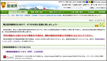 社会災害研究センターの田中聡教授の監修のもとで、大学院環境防災研究科の大学院生が作成した「建物被害調査のトリセツ」が西日本豪雨の被災地で紹介され、浸水や土砂災害に遭われた被災者の方々の生活再建に向けて大いに役立っています。