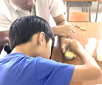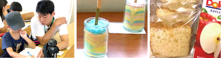学生は、児童と1対1でペアをつくり、勉強やゲームなどのレクリエーション、サンドアートづくりなどに取り組みました。おやつの時間には、健康栄養学科の学生サークル食プロが作ったパウンドケーキをみんなでおいしくいただきました。閉会式では、児童一人ひとりが参加した感想の発表を行い、学生が作成したムービーを観て1日を振り返りました。児童たちは、学生と一緒に夏休みのひと時を楽しく過ごしました。