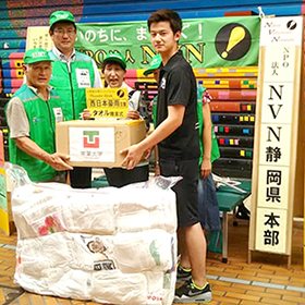 また、Thunder Birdsは7月中旬から支援物資となるタオルの募集を行い、集まったタオルの一部を関市社会福祉協議会に寄付しました。残りは、沼津にあるNPO法人NVNから豪雨被災地に届けることになり、8月11日(土曜日)にNVNの理事長と副理事長に直接受け渡しをしました。