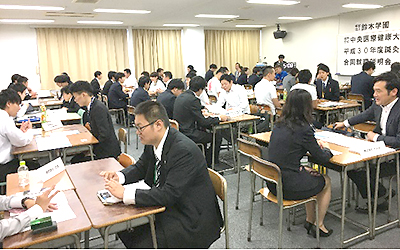 説明会には46施設の医療機関や施術所の人事担当者が出席し、参加学生は熱心に説明に耳を傾けました。参加した学生らは「人事の方と直接お話しすることで、施設の特色や雰囲気がわかった」、「さまざまな情報を一度に得ることができ、有意義だった」などと話し、現場で活躍する方々との交流が進路選択の一助となりました。