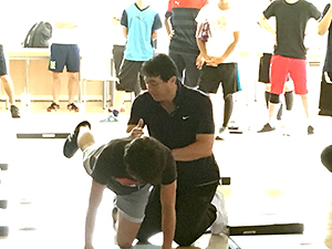 このセミナーは3部で構成され、第1部では、丸山正城先生よりケガの予防や応急処置に効果的な「キネシオテーピング」の実践的手法を、第2部では、プロサッカー選手の長友佑都選手も取り入れている「KOBA式体幹バランストレーニング」考案者の木場克己先生より、トレーニング方法の指導を受けました。最後の第3部では、トータル・セラピスト・コミュニティの星野虎之助理事や山根幸男理事と「キャリア形成」について同学科教員が対談をしました。