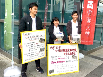 常葉大学ボランティアサークルThunderBirdsの学生9名は、10月13日(土曜日)、14日(日曜日)の2日間、平成30年北海道胆振東部地震による災害支援募金活動を浜松駅前、遠鉄百貨店入り口付近で行いました。