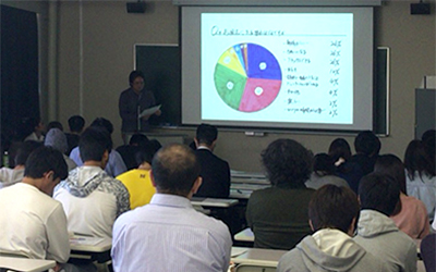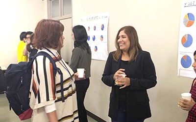 本ワークは、外国人が、興味あるテーマで日本や日本人に対して、アンケートやインタビュー等を行ってデータを収集し、分析、考察をしてまとめたものを発表するもので、ワーク遂行に必要なアンケート回答者やインタビューイーとして、本学の学生80名ほどが協力しています。会場には、63名の来場者があり、外国人の面白い視点に驚いたり、交流会での会話を楽しんだりする様子があちこちで見られました。