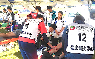 10月28日(日曜日)、第10回しまだ大井川マラソンinリバティにおきまして、本学健康プロデュース学部健康鍼灸学科の学生16名と教員3名が「刺さない鍼(ソマニクス)によるランナーケア」を実施しました。これは、健康鍼灸学科と富士市にある医療メーカーの東洋レヂン株式会社が協同で企画したもので、学生の現場実習、鍼灸の普及活動、地域貢献を目的としています。