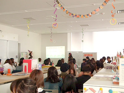 イベントでは、英語やスペイン語を交えつつ、TA(ティーチングアシスタント)さんによる、ハロウィンにちなんだクイズやレクチャー、ゲームが行なわれました。欧米圏のハロウィンだけでなく、メキシコや中南米で祝われる「死者の日」についても紹介があり、ハロウィンを通して、いろんな言語や文化に触れることができたのではないでしょうか。