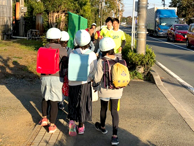 顔合わせ会では、10月31日(水曜日)から始まる児童下校時の見守り活動に向け、学生たちが全校児童の前で自己紹介や活動内容の紹介。「走っている姿を見かけたら、気軽に声を掛けてほしい。」と児童に呼びかけました。参加した岡田賢太さん(4年)は「みんなで安全を守り、ゆくゆくは地元に根付いた活動にしていきたい。」と意気込みました。