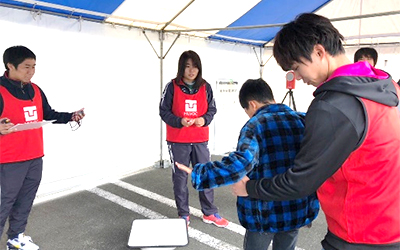 体力測定コーナーでは心身マネジメント学科井口ゼミの学生が中心となり、安全性とイベント性を考慮して、握力、長座体前屈、バランス、全身反応時間、動体視力の5つの項目を実施しました。来場者には作成したワンポイントアドバイスを配布し、記録とともに今後の競技力向上に役立ててもらうようアドバイスしました。