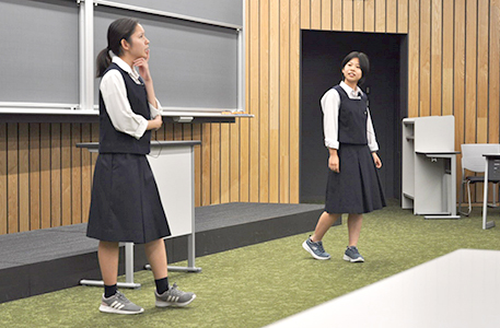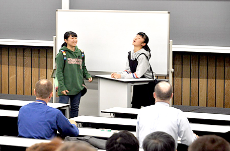 本学外国語学部主催の本大会は、2人一組での対話形式で行うが特徴で、出場者は日頃の問題意識を反映したオリジナルのスキットを、身振り手振りを交えながら披露しました。