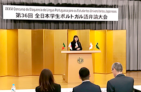 第36回全日本学生ポルトガル語弁論大会が11月24日(土曜日)に京都外国語大学で開催され、本学外国語学部グローバルコミュニケーション学科3年生の亀井李佳さんが7位に入賞しました。亀井李佳さんは、「大切な人」というタイトルで5分間のスピーチを行い、自分の考えや思いを適切に表現できていると評価され、「京都ラテンアメリカ文化協会賞」を受賞しました。