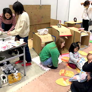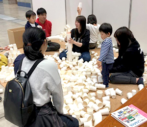 この日、会場には1万1千人を超える来場者があり、常葉大学のブースにも絶え間なく子どもたちが訪れました。高ゼミ、中村ゼミ、柴田ゼミの学生は、日頃の学びを活かし、絵本の読み聞かせや紙コップを使ってタワーを作る造形遊び、ダンボールを使った迷路、新聞紙を使った遊びの提供など、身近なもので作ったおもちゃや道具で来場した子どもたちと触れ合いました。学生は、子どもたちと触れ合うなかで、さまざまな遊びのアイディアが生まれ、子どもたちの発想力や感性を知ることができ、将来につながる「保育の実践の場」となりました。