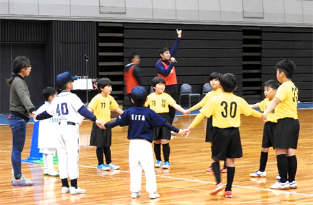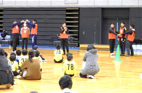 12月1日(土曜日)、浜松アリーナで行われた「浜松市スポーツ少年団交流会」で、健康プロデュース学部心身マネジメント学科の学生8名が、スポーツ少年団に所属する小学生および保護者約270名を対象にした交流会を実施しました。スポーツ少年団の理念は、スポーツを通じた人づくり、そして地域交流など。日頃は別々の少年団に所属し、活動している子どもたちの交流の場として開催されました。