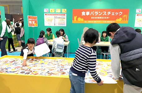 このイベントは、子どもから大人まで楽しみながら医療技術を学ぶことができ、医師、看護師などの医療現場を体験できました。本学学生は管理栄養士を紹介するブースで、参加者が選んだ食事カードの栄養バランスをチェックし、栄養が足りない場合は、具体的な食材や料理を提案するなど、一人一人に丁寧にアドバイスしました。参加した親子からは、「我が家の食事はバランスがよいことがわかった」「毎日の食事を見直したい」「足りない料理がわかった」などの感想が聴けました。