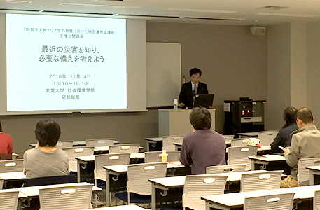 地域住民支援の一環として、防災に対する基礎知識を知っていただき、学んでいただくことを目的とした公開講座を開催しました。第一部では、静岡市総務局危機管理総室長の森山 務氏から近年における災害の状況を例にあげ、各災害の特性や教訓についてお話がされました。また、自助、共助、の視点から私たちの取るべき行動等についても詳しく説明していただきました。第二部では、本学社会環境学部阿部教授より、最近の災害の特徴とそこから学べることや地域の歴史と成り立ちを知ることの大切さについてお話がされました。自分の住んでいる土地の歴史を知ることによって、どんな注意が必要か、住まいにどんな工夫をすべきかを考えることができると話され、具体的な事例が紹介されました。真剣に聞き入っていた受講者からは「防災組織体制について詳細な説明を受け、安心感を抱いた一方、ベースとして自助・共助の部分を私たち一人ひとりが普段から意識して準備していなければならないことを痛感した」、「情報を迅速に受け取り、災害に対して自分でも何かができることがあれば協力したいという気持ちが多く持てた」、「東南海地震の危険性が永く言われ続けている中、このような情報は本当に必要なことだと思った」等の感想が寄せられました。