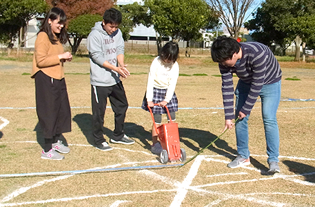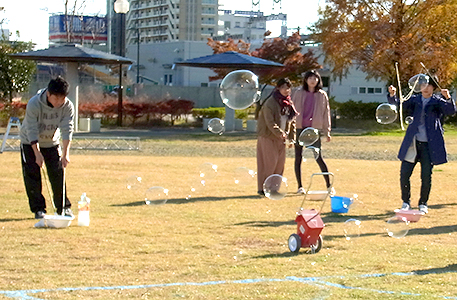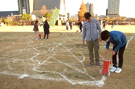 これは、40×40m、およそ1600㎡の広い芝地に、ラインマーカー10台で線を引き、大きな富士山の絵を描くものです。またその上に、巨大シャボン玉を飛ばして、富士山にかかる雲や霞も表現しました。広場に散歩に来た親子連れなど一般市民73名にも参加いただき、静岡市が目的とする公園のにぎわい創出に、学生たちが一役買いました。