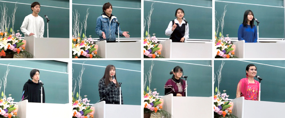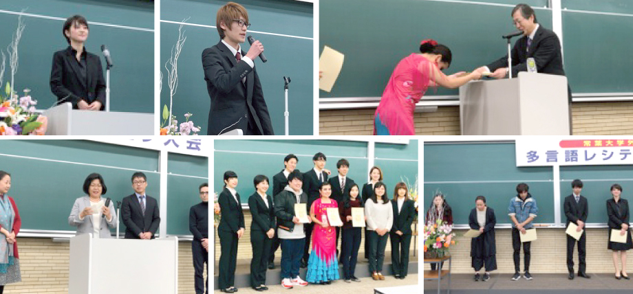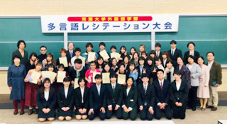 中国語、韓国語、スペイン語、ブラジル・ポルトガル語の四言語あわせて47名(外国語学部生39名、高校生8名)が出場し、うち11名はグローバル・コミュニケーション学科のカリキュラム「二言語学習」を反映した二言語のレシテーションに挑戦しました。また、県内の3高校からの参加者があり、素晴らしいレシテーションを披露してくれ、学生の良い刺激となりました。