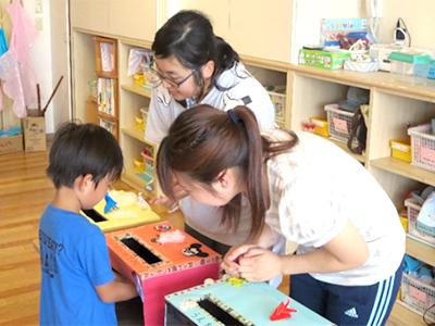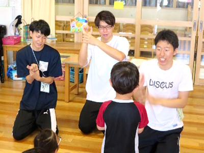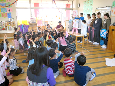 本学健康科学部看護学科小児看護学教員が担当する「看護基礎ゼミナール」受講生(2年生)14名が、“君も手洗いマスターになろう”プロジェクトを結成しました。このプロジェクトの目的は、感染症の拡大予防の為、正しい手洗い方法を園児に伝授することです。前期は、食中毒予防目的で7月10日(火曜日)常葉大学附属たちばな幼稚園を訪問しました。後期にはインフルエンザ予防を目的に10月31日(水曜日)とこは幼稚園を訪問しました。学生たちは、園児の発達段階や子どもの特性を考え、紙芝居を作成し、その中で手洗いの重要性を伝えました。また、学生が手洗いマスターに扮して、園児たちに洗い残しやすい部分を強調した手洗いの歌も披露しました。園児たちは、手洗いの歌を大熱唱しながら正しい手洗いを即座に覚えて、楽しく実施していました。活動に参加した学生は、企画から運営を経験し、看護実践能力に必要となるチーム力を学ぶ機会となりました。常葉大学附属たちばな幼稚園・とこは幼稚園のご協力のもと行われたこの取り組みは、幼大連携の一つとなり今後も地域を広げ活動していきたいと考えます。
