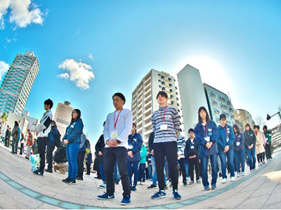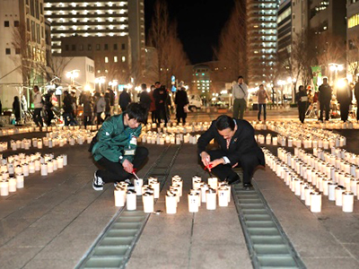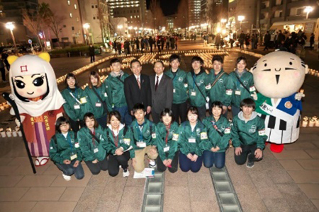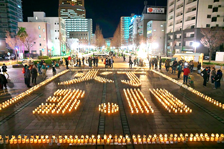 東日本大震災から8年を迎えた3月11日(月曜日)、浜松キャンパスの学生を中心に市内4大学の学生130人が、浜松市のアクト通りで「3.11復光キャンドルナイト」を開催しました。