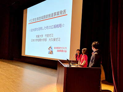 経営学部竹安ゼミ3年生の鶴牧 咲良さん・大西 亜実さんが、3月15日に小山町総合文化会館で小山町民、小山高等学校1〜2年生を対象に開催された「金太郎まちづくり活動発表大会」にて「金太郎を活用した町の広報戦略」の発表を行いました。