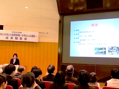「2018年度 浜松市と大学との連携事業~大学生による講座 成果報告会」が3月5日(火曜日)、浜松市地域情報センターで行われました。本事業に参加した浜松市内5大学の各学生グループが、スポーツ、健康増進、国際理解などのテーマで実施した講座について、具体例を発表しました。