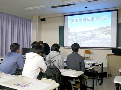 学生は3~4人のグループを作り、実地調査を行いました。実際に天浜線に乗車し、さらに主要駅で貸し出しているレンタサイクルに乗って、周辺地域の名所旧跡やグルメスポットを巡りました。その後はコースにするために、どこをマップに取り上げるか、経路はどのようにするか等を話し合い、マップの原案を製作しました。