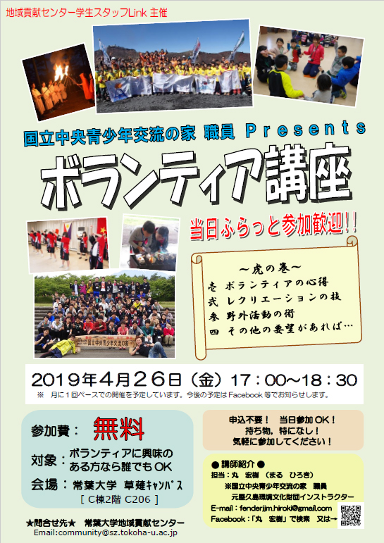 地域貢献センター学生スタッフLinkが企画したボランティア講座を、4月26日(金曜日)に開催しました。講師として、独立行政法人国立青少年教育振興機構(国立中央青少年交流の家)の職員・丸 宏樹氏を招き、『レクリエーション×教育』をテーマに、ボランティアの心得やレクリエーションの技を学びました。