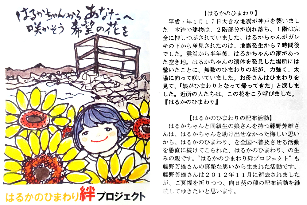 『はるかのひまわり絆プロジェクト』は、1995年1月17日の阪神淡路大震災の犠牲になったはるかちゃんの遺体発見現場に、震災から半年後、無数のひまわりが咲いていたのをきっかけに災害の悲惨さと共に命の尊さを再考する機会とすることで、人の尊厳と人との関わりの大切さを知る感性豊かな地域社会を醸成することを目的としています。